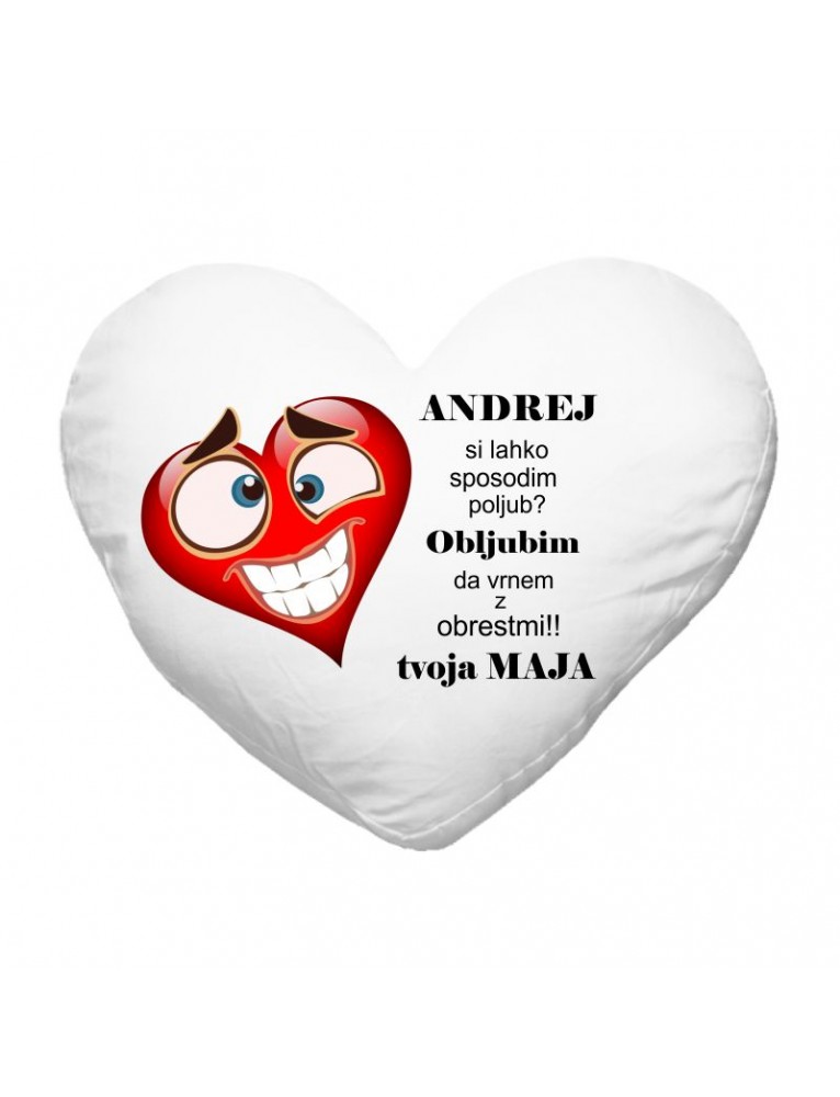 Blazinica v obliki srca z napisom: ANDREJ (ime po vaši izbiri), SI LAHKO SPOSODIM POLJUB? OBLJUBIM DA VRNEM Z OBRESTMI!! TVOJA MAJA (ime po vaši izbiri). Na blazinici je še slikica srca kateri se veselo, ob misli na dobljene poljube, smeji.