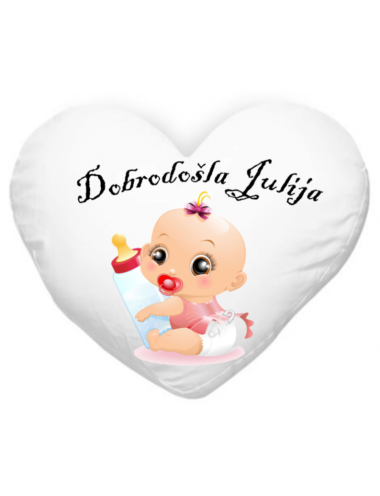 Blazinica v obliki srca z napisom: DOBRODOŠLA JULIJA (ime po vaši izbiri). Na blazinici je še slika dojenčka, kateri drži v roki flaško.