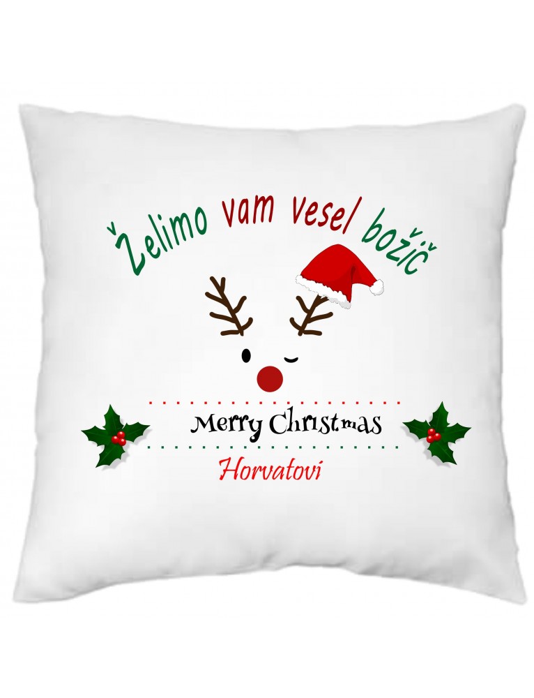 ŽELIMO VAM VESEL BOŽIČ MERRY CHRISTMAS (priimek po izbiri) je natisnjeno na tej blazinici. Poleg napisa je zraven še slikica jelenčka, ki ima božično kapo.