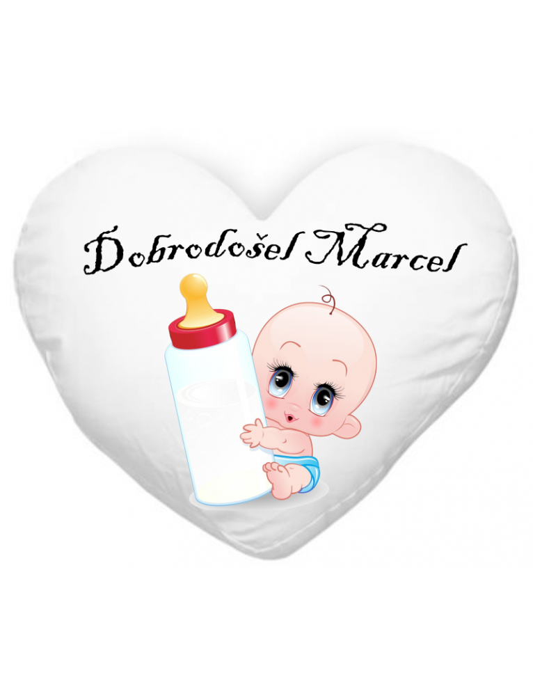 Blazinica v obliki srca z napisom: DOBRODOŠEL MARCEL (ime po vaši izbiri). Na blazinici je še slika dojenčka, kateri drži v roki flaško.