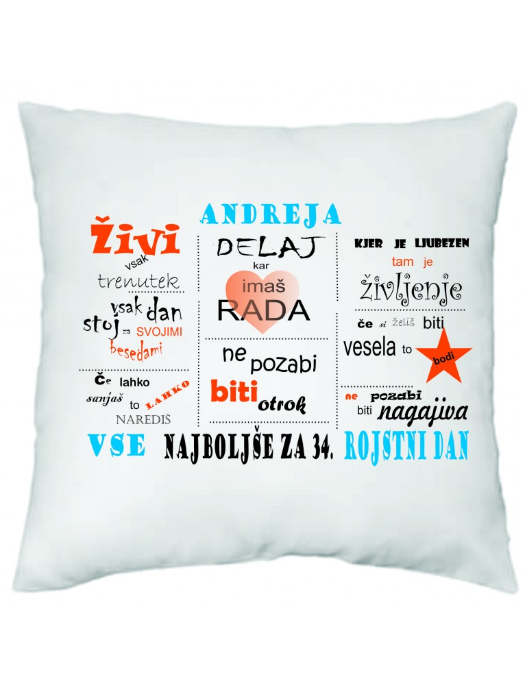 Blazinica s polnilom je v velikosti 40 cm x 40 cm. Med napisi na blazinici, ki se ne izperejo se menjava ime in letnica čisto po vaši izbiri.