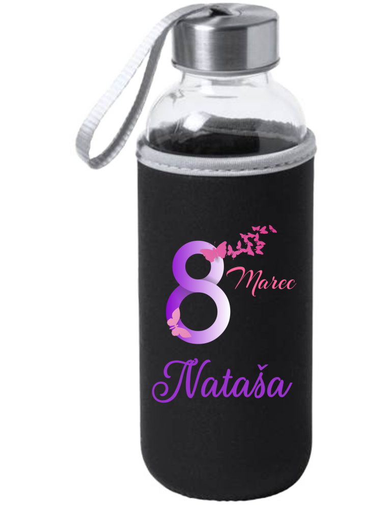 Steklenica zavita v neopren na kateri je napis: 8 MAREC NATAŠA (oseba po vaši izbiri). Na steklenici je še fotografija metuljčkov.