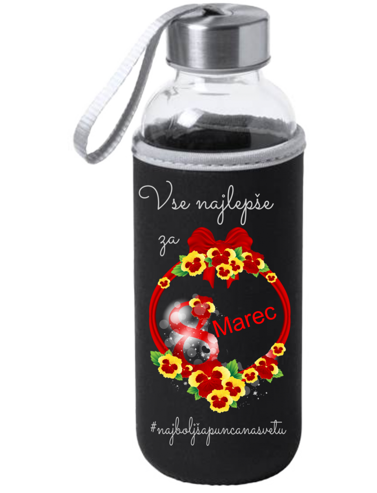 Steklenica zavita v neopren na kateri je napis: VSE NAJLEPŠE ZA 8. MAREC #NAJBOLJSAPUNCANASVETU (oseba po vaši izbiri). Na steklenici je še fotografija mačehic.