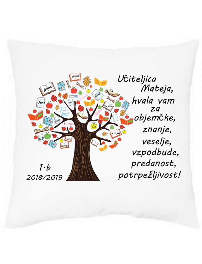 Blazinica z napisom: UČITELJICA MATEJA (ime po vaši izbiri) HVALA VAM ZA OBJEMČKE, ZNANJE, VESELJE, VZPODBUDE, PREDANOST, POTRPEŽLJIVOST. 1.B 2018/2019 (besedilo in letnica po vaši izbiri) Na slikici drevesa po vaši želji zapišete še imena učencev.