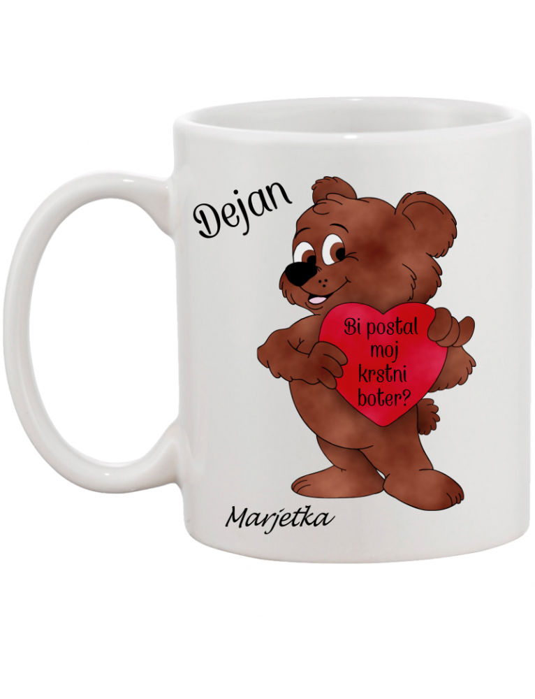 Skodelica na kateri je napisano za botra: DEJAN (ime po vaši izbiri) BI POSTAL MOJ KRSTNI BOTER? MARJETKA (ime po vaši izbiri). Na skodelici je še fotografija prikupnega medvedka.