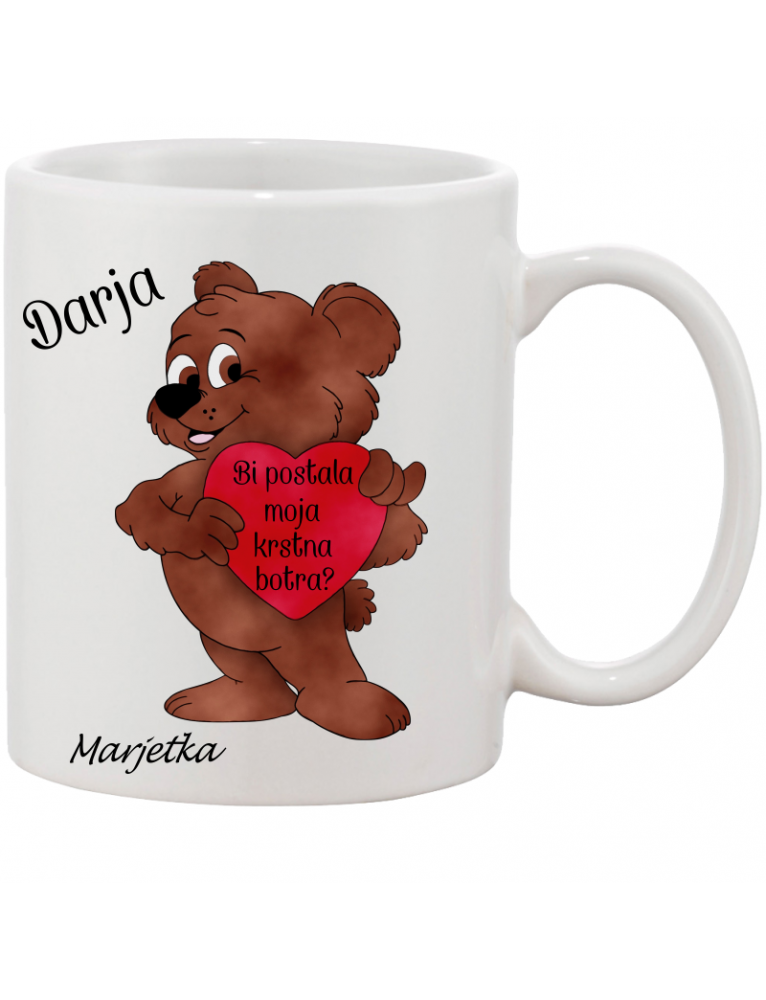 Za botro pa je napisano: Darja (ime po vaši izbiri) BI POSTALA MOJA KRSTNA BOTRA? MARJETKA (ime po vaši izbiri). Na skodelici je še fotografija prikupnega medvedka.