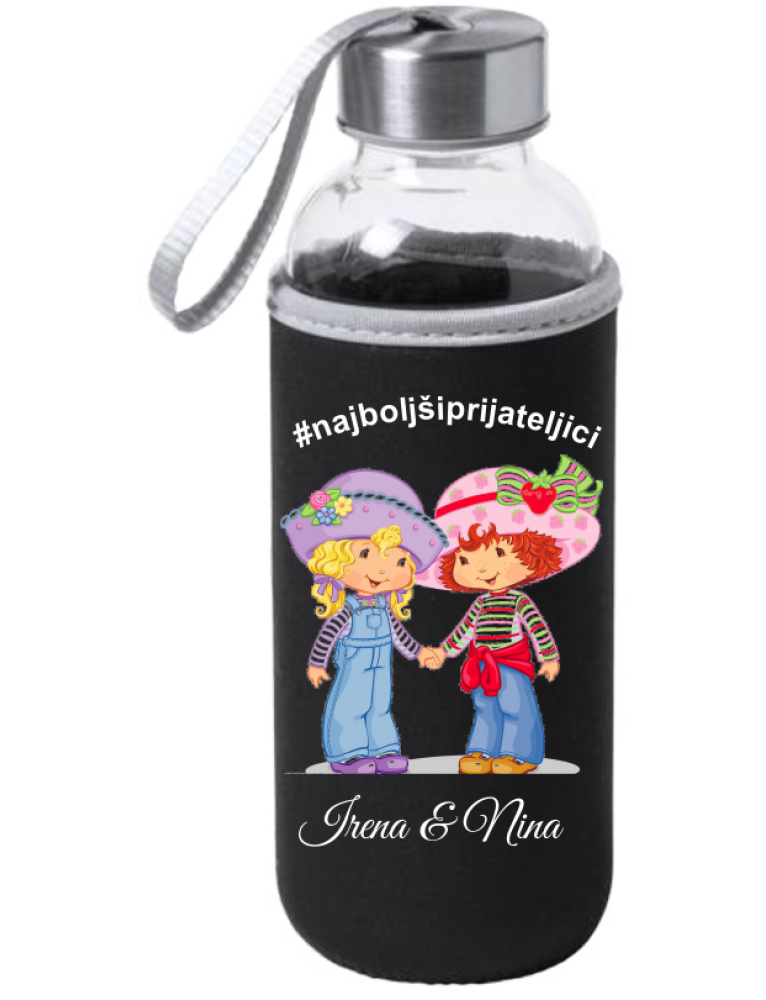 Steklenica zavita v neopren na kateri je napis: #najboljšiprijateljici Irena&Nina (imeni po vaši izbiri). Na steklenici je še fotografija dveh deklet.