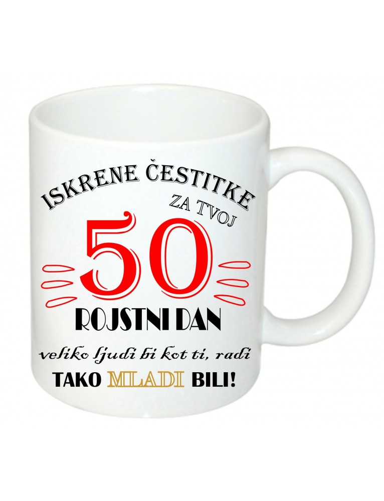 Skodelica 50 za njo. ISKRENE ČESTITKE ZA TVOJ 50 (letnica po izbiri) ROJSTNI DAN. VELIKO LJUDI BI KOT TI, RADI TAKO MLADI BILI!, je napis na skodelici.