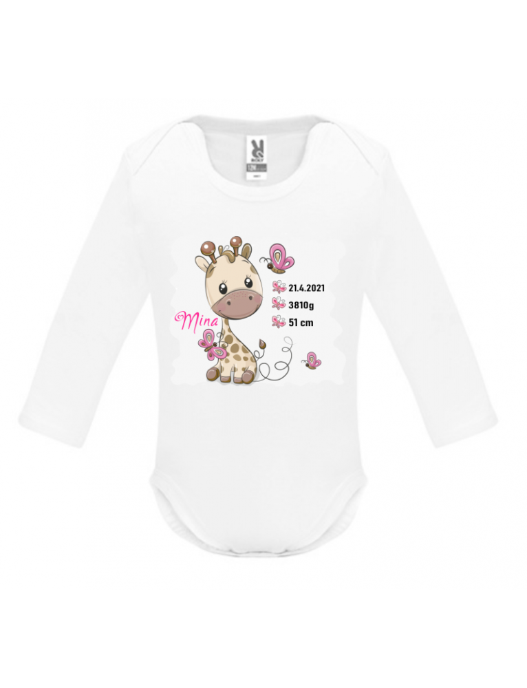 Bodi s podatki o rojstvu (ime, datum, teža, velikost). Poleg podatkov bodi krasi še prikupna žirafica.