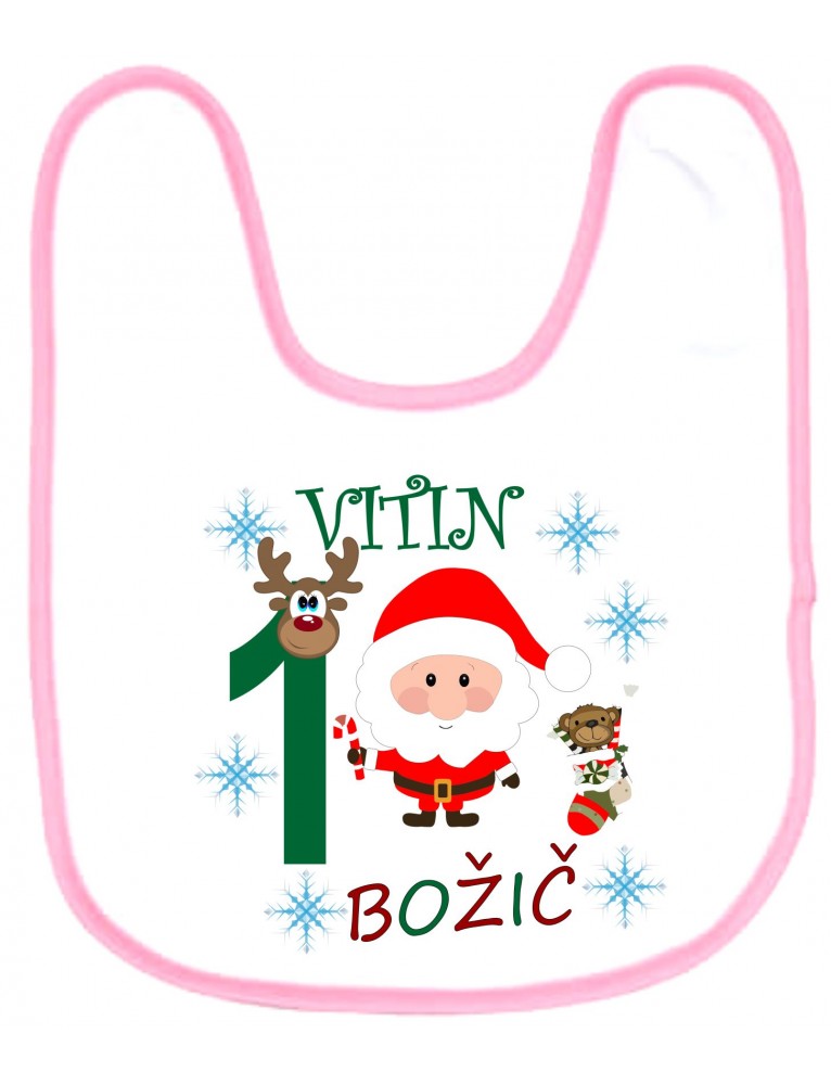 Slinček na otip iz prijetnega mikrofibra ima napis: Vitin (ime po izbiri) PRVI (številka po zbiri) BOŽIČ. Na slinčku sta še fotografiji božička in božičkove nogavice z medvedkom.