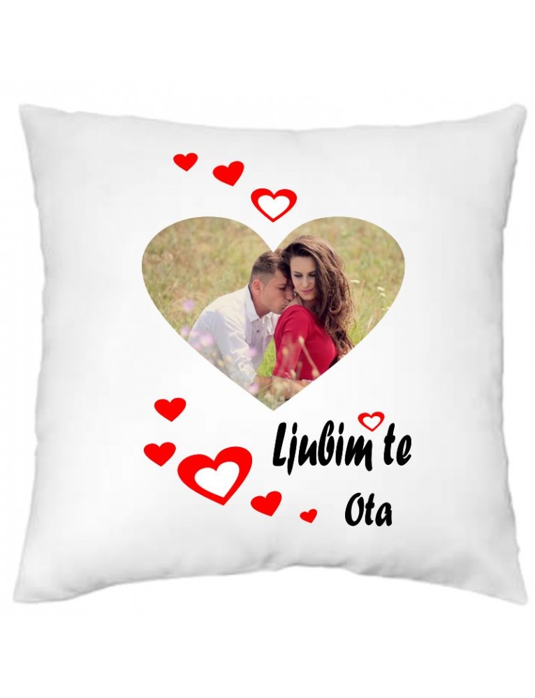Blazinica s fotografijo po želji, ki jo oblikujemo v obliko srca. Na blazinici je napis LJUBIM TE ter ime po vaši želji.