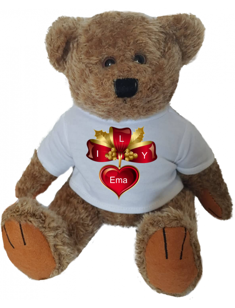 Medvedek z oblečeno majico, na kateri je božični motiv s pripisom imena po vaši izbiri ter napisom ILY.