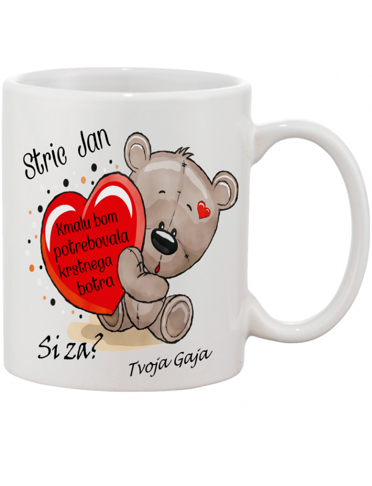 Za botra pa je napisano: STRIC JAN (ime po vaši izbiri) KMALU BOM POTREBOVALA KRSTNEGA BOTRA. SI ZA? TVOJA GAJA (ime po vaši izbiri). Na skodelici je še fotografija prikupnega medvedka.