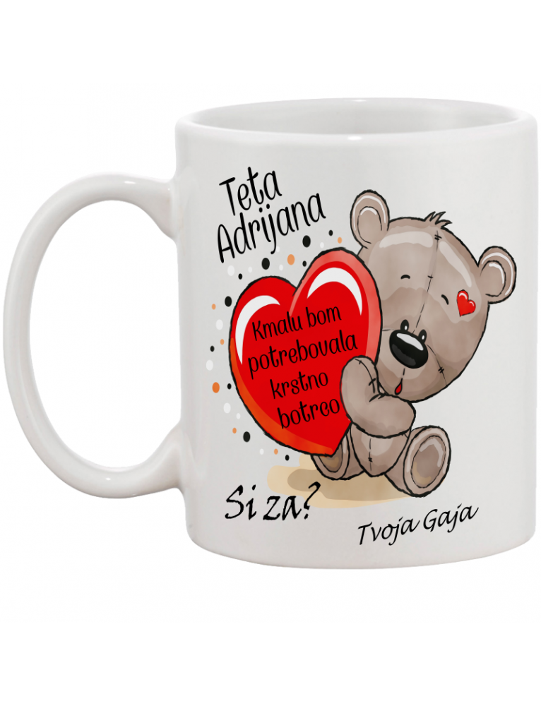 Skodelica na kateri je napisano za botro: TETA ADRIJANA (ime po vaši izbiri) KMALU BOM POTREBOVALA KRSTNO BOTRCO. SI ZA? TVOJA GAJA (ime po vaši izbiri). Na skodelici je še fotografija prikupnega medvedka.