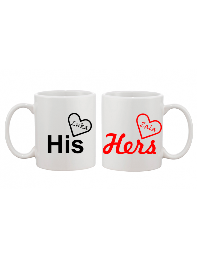 Skodelica s prisrčnim napisom: HIS (po vaši izbiri bo ime osebe zapisano v srcu), HERS (po vaši izbiri bo ime osebe zapisano v srcu).