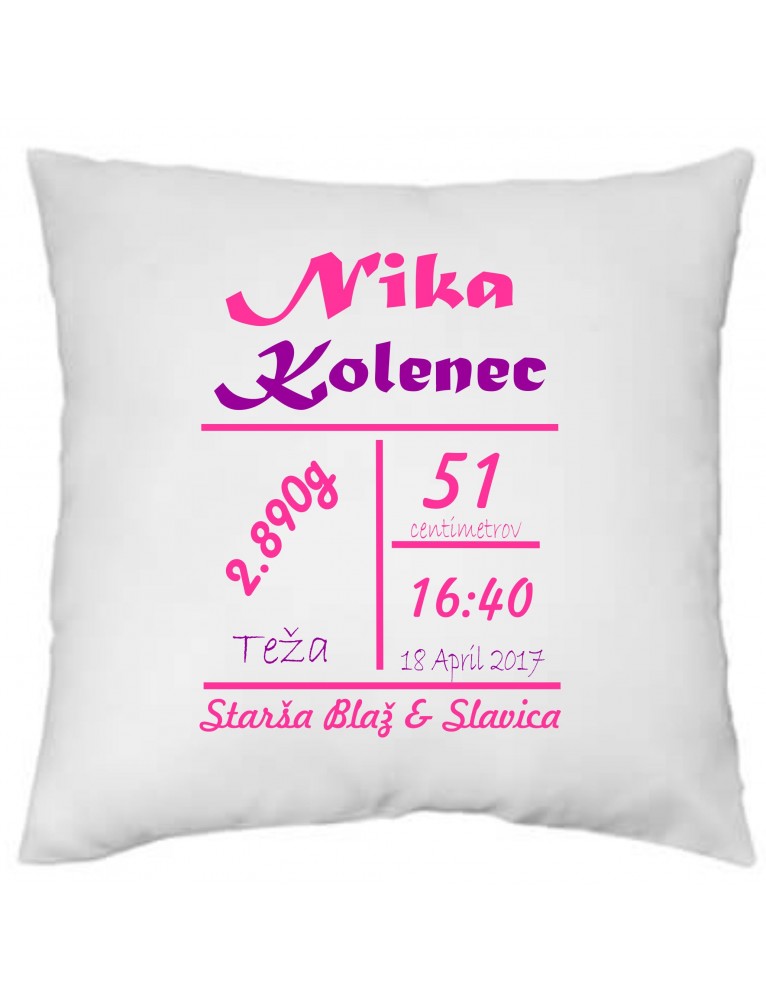 Blazinica, ki ima poleg rojstnih podatkov otroka, še pripisano ime staršev. Barve napisa so prilagojene za deklico.